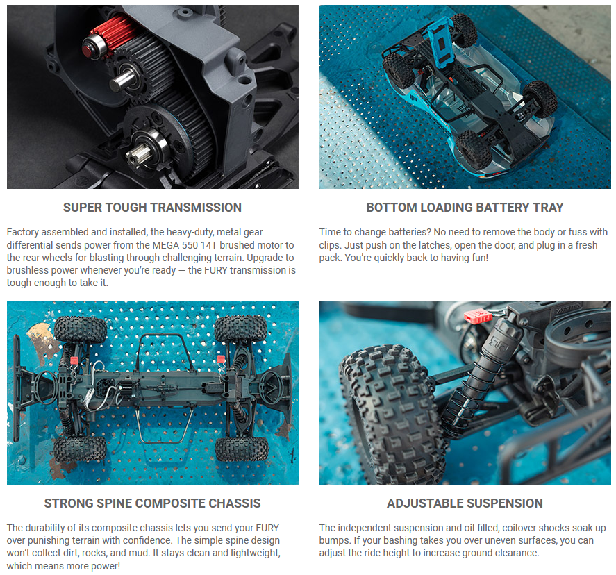 The ARRMA FURY 2WD is the most affordable hobby-quality 1/10 scale short course truck available. And it’s easy to upgrade with LiPo batteries, brushless motors, and option parts whenever you’re ready to take it to the next level. The FURY chassis offers enormous potential to raise performance and grow your bashing skills!