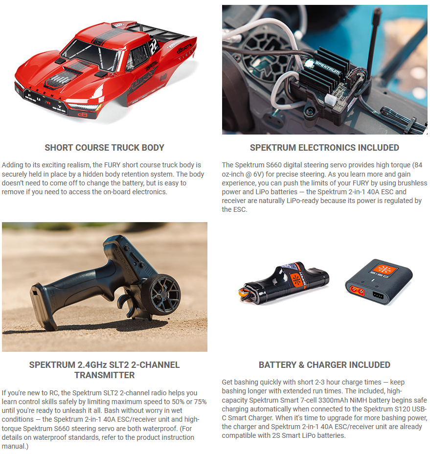If you’re new to RC, the Spektrum SLT2 2-channel radio included with the FURY helps you learn control skills safely by limiting maximum speed to 50% or 75% until you’re ready to unleash it all. Blast through wet conditions without worry — the Spektrum 2-in-1 40A ESC/receiver unit and high-torque Spektrum S660 steering servo are both waterproof (see the FURY instruction manual for details).