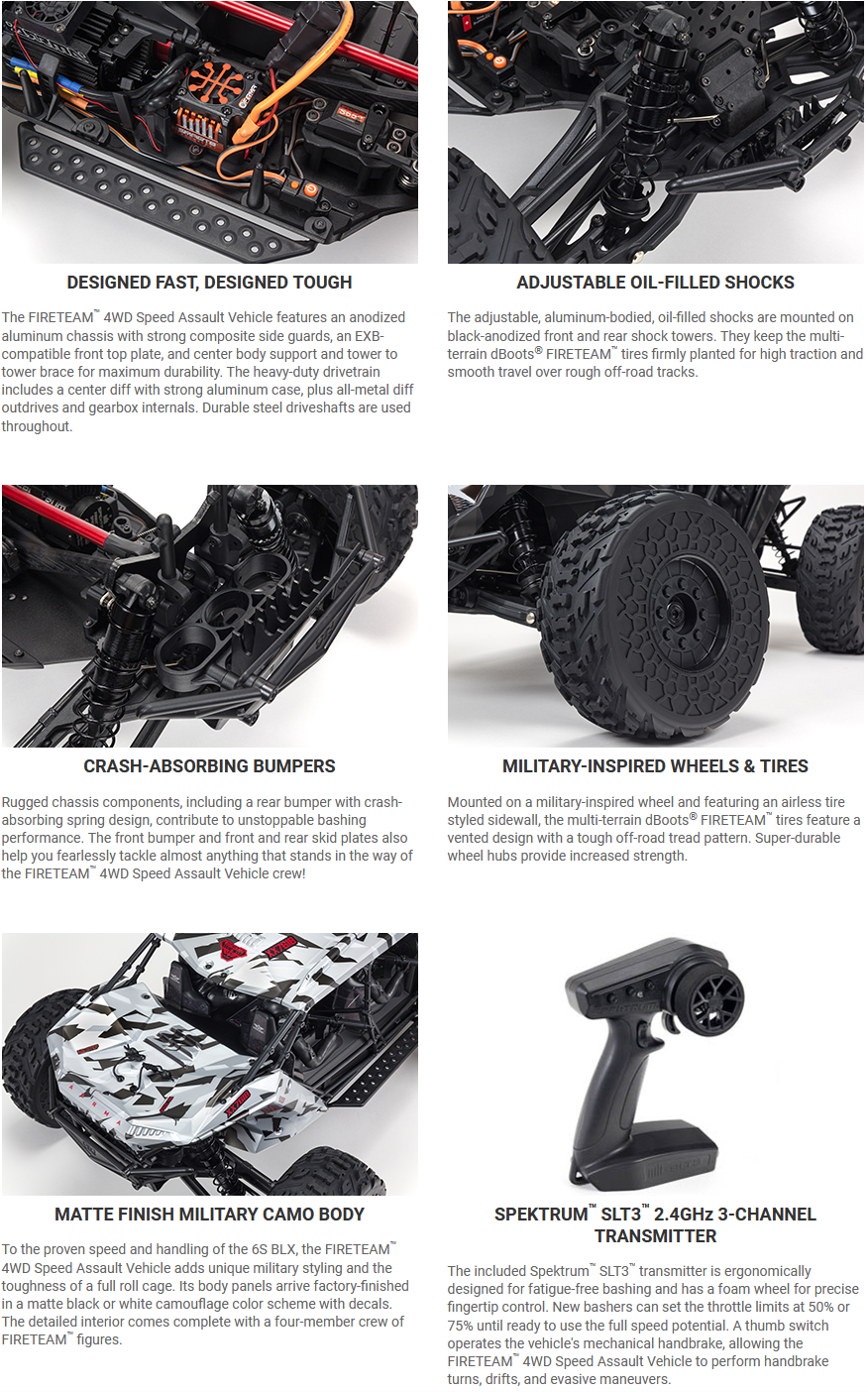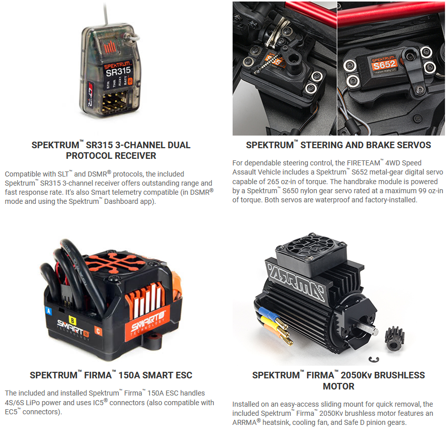 A factory-installed Spektrum&trade 6S brushless power system enables the FIRETEAM&trade 4WD Speed Assault Vehicle to perform huge jumps at 60+ mph speeds over brutal terrain. The extra-long wheelbase and wide-track suspension, along with adjustable, aluminum-bodied, oil-filled shocks, keep you confidently in control. From the bumpers and skid plates to the heavy-duty metal drivetrain, the characteristically rugged ARRMA® design lets you fearlessly tackle almost any obstacle blocking the FIRETEAM&trade crew from its mission.