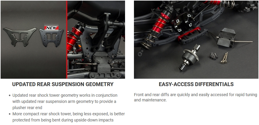 - Updated rear shock tower geometry