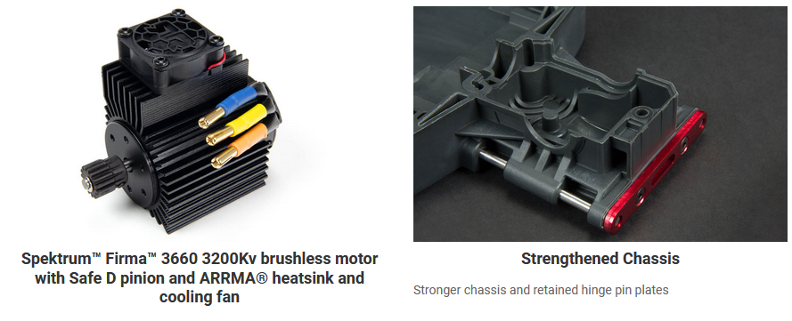 Its full-time 4WD transmission uses strong front, rear, and centerline telescopic driveshafts that can’t be lost during heavy impacts, unlike dogbones. A simple, dependable, responsive steering assembly complements the ultra-reliable drive system and features a servo horn with built-in servo saver. The SENTON™ 4X4 3S BLX RTR includes the waterproof Spektrum™ SPMS651 metal-geared digital servo for 15% more torque than the previous version’s ADS-7M servo.