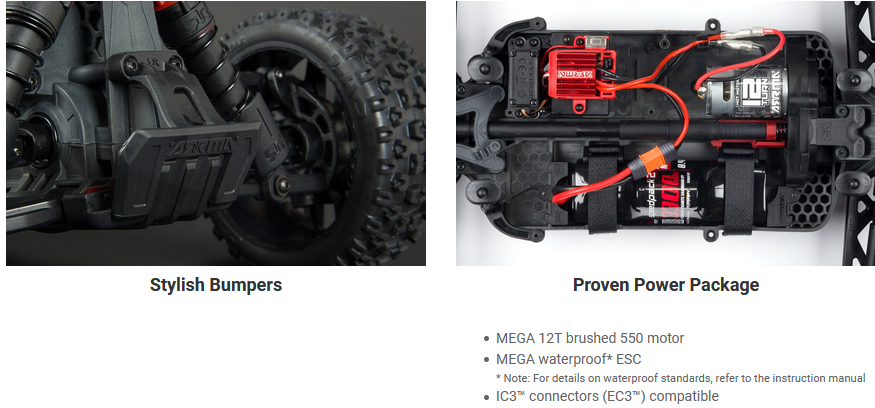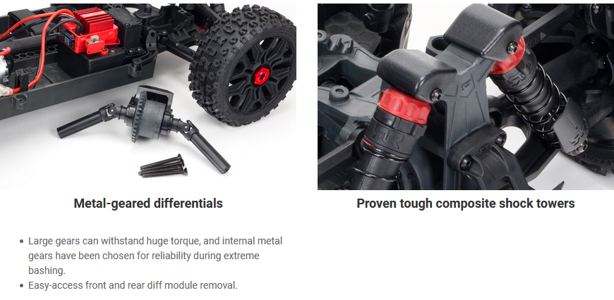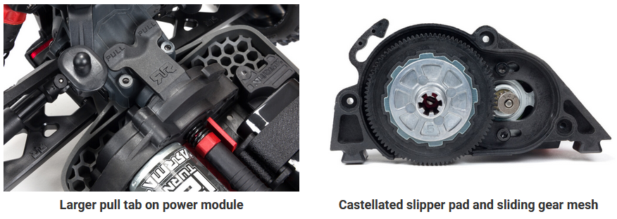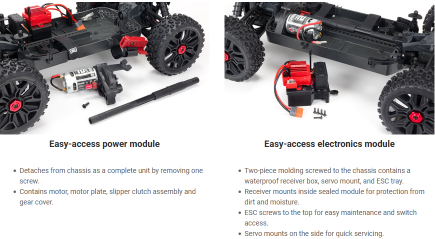 It also has the ingenious modular design perfected by ARRMA® engineers for easy component access and maintenance. The power module, with improved dirt management, consists of a MEGA 550 motor for rock-jumping speed, plus motor plate, slipper clutch assembly and gear cover. The power module can be detached from the chassis as a complete unit by removing just one screw. With the power module removed, the slipper clutch can be reached easily for adjustments by taking out three screws that attach the gear cover. The gear ratio can be finely tuned as the power module now uses a sliding motor mesh design.