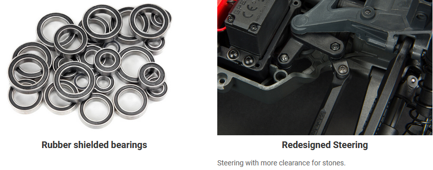 The self-bleeding, oil-filled shocks, now with silicone O-rings, use a tried and tested, coil-over design for simple maintenance and amazing handling. Their innovative rod-end has a molded-in spring perch for extra toughness. High chassis sides and a close-fitting buggy body limit the amount of dirt and debris that can get into the chassis tub. Front and rear bumpers offer defense against impacts.