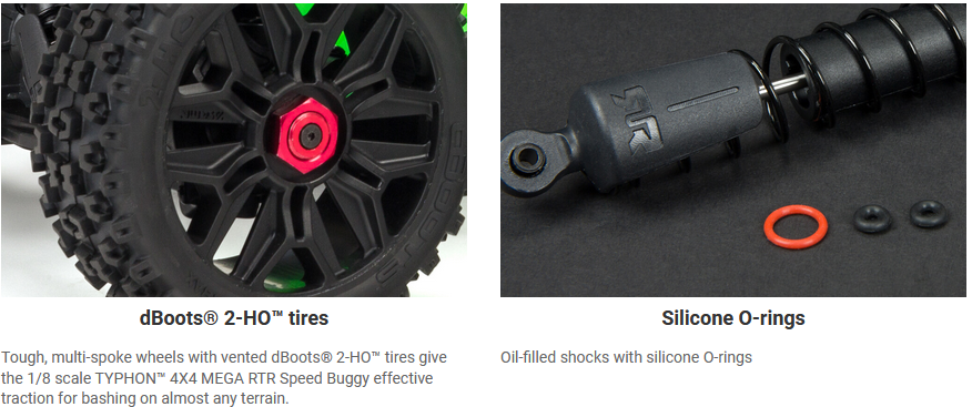 Tough, multi-spoke wheels with vented dBoots® 2-HO™ tires give the 1/8 scale TYPHON™ 4X4 MEGA RTR Speed Buggy effective traction for bashing on almost any terrain. Multiple battery types can be used with the hook-and-loop mounting, from 6-cell NiMH packs to a 2S block pack. This version comes with a Dynamite® 3300 mAh 8.4V 7-cell Speedpack® 2 Hump NiMH battery that provides 35% more run time compared to the 2400mAh pack of its predecessor.