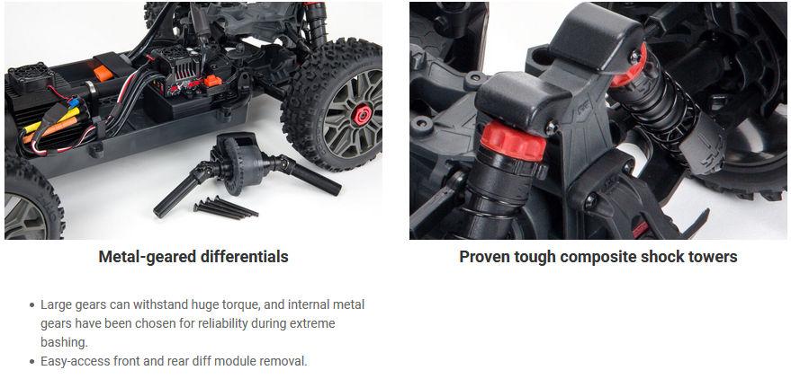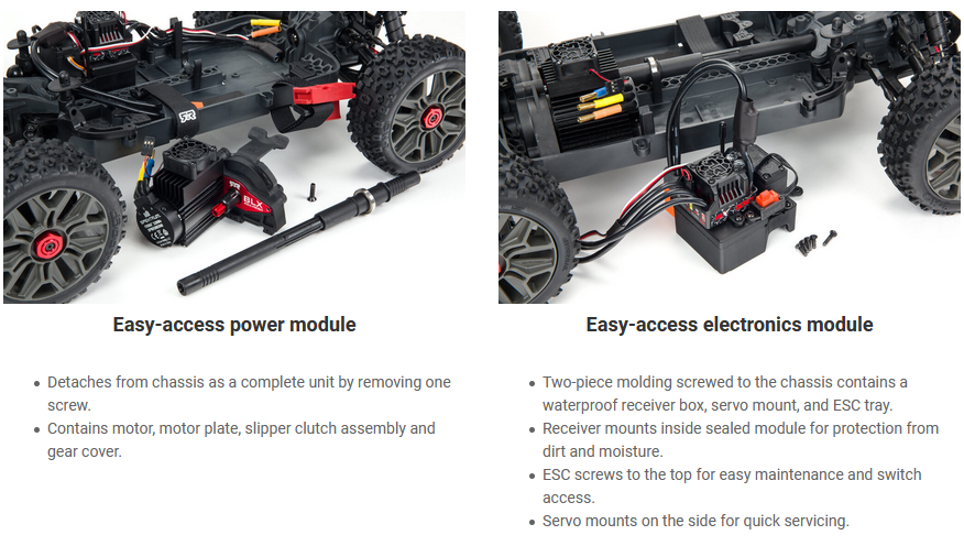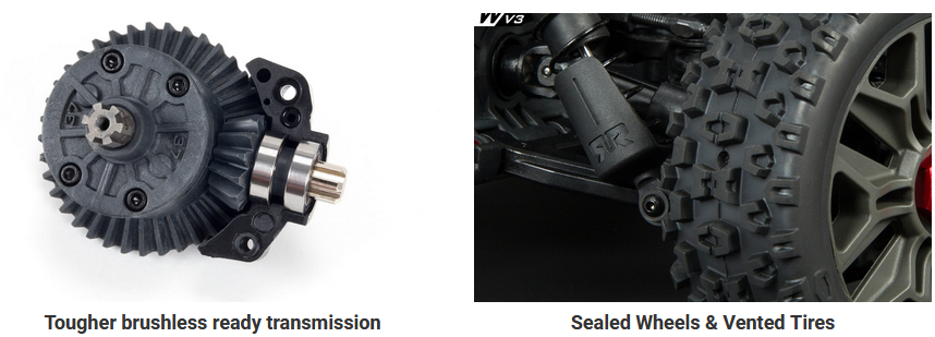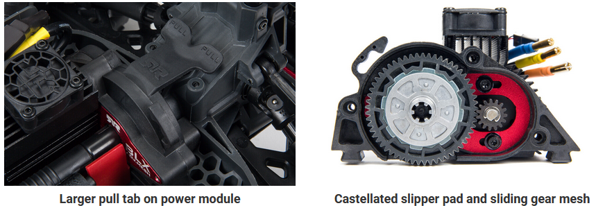 It has the ingenious modular design perfected by ARRMA® engineers for easy component access and maintenance. The power module, with improved dirt management, consists of the motor with ARRMA® heatsink and cooling fan, plus motor plate, slipper clutch assembly and gear cover. The power module can be detached from the chassis as a complete unit by removing just one screw. With the power module removed, the slipper clutch can be reached easily for adjustments by taking out three screws that attach the gear cover. The gear ratio can be finely tuned as the power module now uses a sliding motor mesh design.