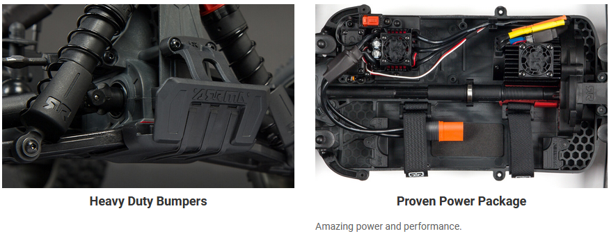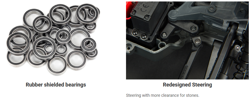 The self-bleeding, oil-filled shocks, now with silicone O-rings, use a tried and tested, coil-over design for simple maintenance and amazing handling. Their innovative rod-end has a molded-in spring perch for extra toughness. High chassis sides and a close-fitting buggy body limit the amount of dirt and debris that can get into the chassis tub. Front and rear bumpers offer defense against impacts.