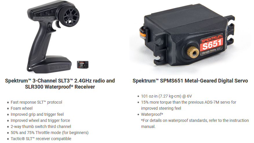 It also now includes a Spektrum™ SLT3™ transmitter and SLR300 receiver. The transmitter is ergonomically designed for long periods of fatigue-free bashing and has a foam wheel for precise fingertip control plus an improved hand grip and trigger feel. New bashers will be able to set throttle limits at 50% or 75% until they are ready to use the full speed potential. The SLT3™ is compatible with Tactic® SLT™ receivers to run other RTR vehicles you may own, and includes a third channel to control optional features such as lights and winches on models that have them.
