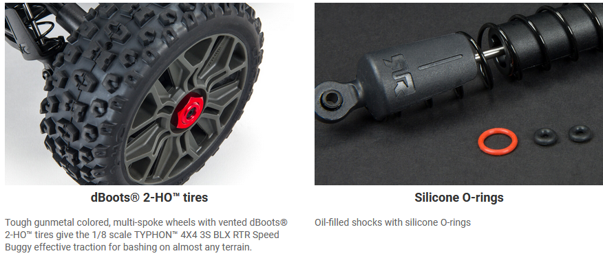 Tough gunmetal colored, multi-spoke wheels with vented dBoots® 2-HO™ tires give the 1/8 scale TYPHON™ 4X4 3S BLX RTR Speed Buggy effective traction for bashing on almost any terrain. With the metallic-finish body and forged composite detail, it also looks as great as it performs. A stylish, high-downforce wing keeps all four wheels planted as you explore the upper limits of its outrageous speed range.