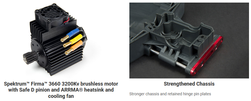 ARRMA® now powers the TYPHON 4X4 3S BLX with a brushless system featuring its BLX100 ESC and the Spektrum™ Firma™ 3200Kv brushless motor. The combination provides incredible torque, acceleration and speed. The transmission and chassis are ruggedly engineered to take full advantage of the electronics’ power — in ARRMA tradition, DESIGNED FAST, DESIGNED TOUGH.