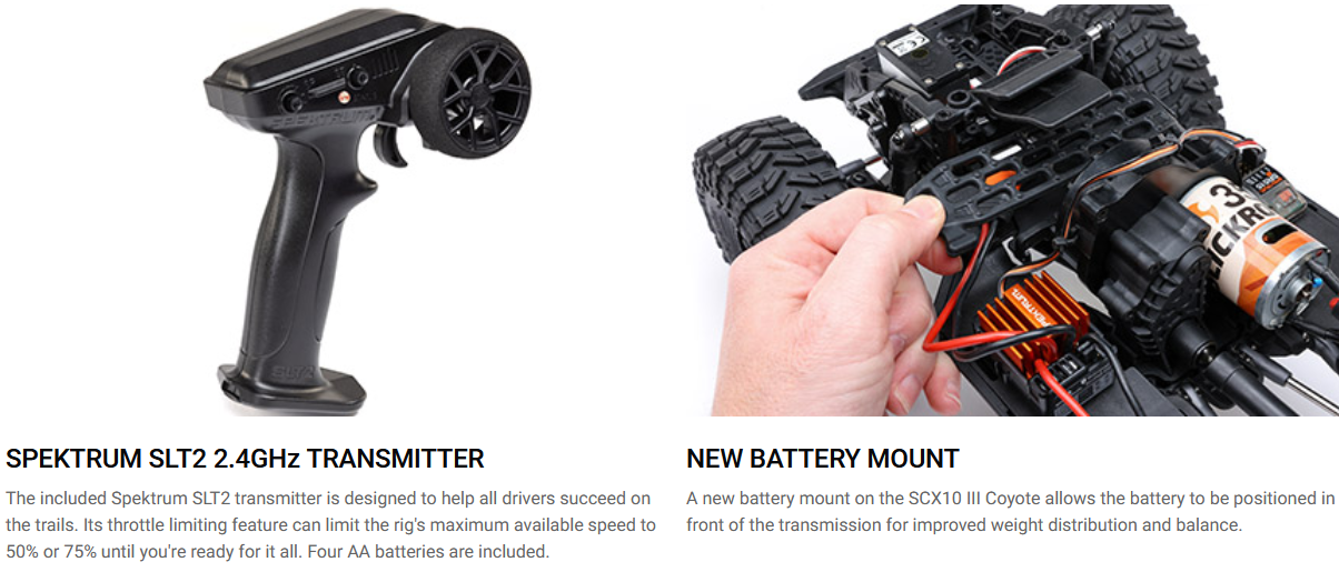 Adding to the value of the Axial SCX10 III Coyote, the ready-to-run package comes with a 2-channel Spektrum SLT2 radio designed to help all drivers succeed on the trails. If this is your first RC vehicle, the radio’s throttle limiting feature lets you learn control skills safely and with confidence. With the flip of a switch, you can limit maximum speed to 50% or 75% until you’re comfortable driving at full power. Four AA transmitter batteries are included.