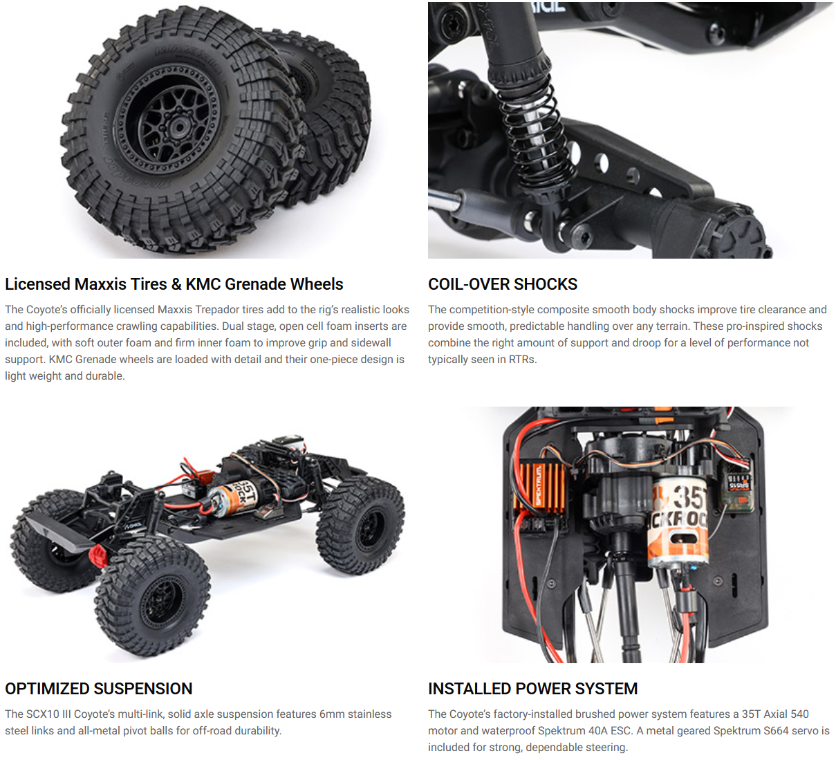 But the Coyote is much more than an SCX10 III with a new look. Axial has taken its proven 1/10-scale platform to another level. All-new oil-filled shocks and shock towers add more adjustability. Overdrive gears in the front axle increase maneuvering and climbing ability for getting to and through the gates. New sliders have smooth undersides for better performance and body fit. Officially licensed Maxxis Trepador tires and KMC Grenade wheels, with dual stage open cell foam inserts, add to the rig’s realistic looks and high-performance crawling capabilities. And a new battery mount lets you position the battery in front of the transmission, improving weight distribution and balance.