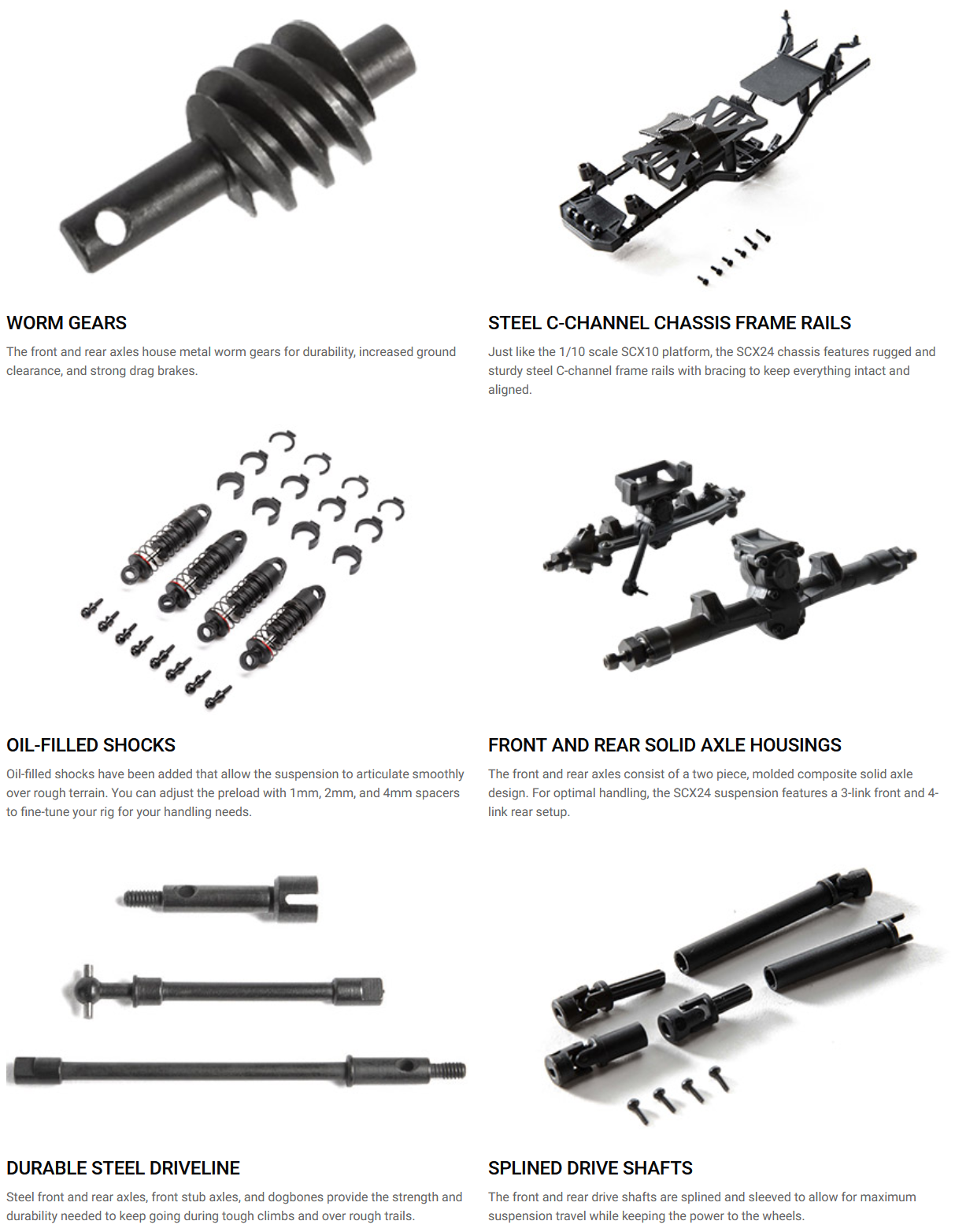 Plush oil-filled shocks have been added for a suspension that soaks up bumps and provides a stable ride over rugged terrain. Reliable Spektrum electronics are now included for dependable control. Completely assembled, fully equipped, and improved with key upgrades, the SCX24 C10 is a perfect choice for hobby beginners as well as experienced Axial RC enthusiasts.