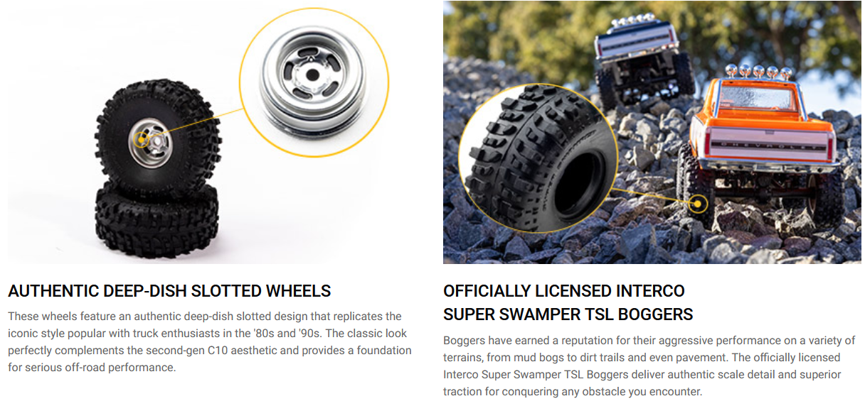 Three interchangeable front grilles are included: the iconic 1967/68 style, the bold 1969/70 design, and the distinctive 1971/72 look. Swap them out to match your favorite year or create the perfect custom build. The body features a stylish 2-tone finish via applied graphics that can easily be removed if a single color suits your style better. New authentic deep-dish slotted wheels replicate the iconic style that dominated the '80s and '90s truck scene, mounted with officially licensed Interco Super Swamper TSL Boggers that have earned a reputation for aggressive performance on everything from mud bogs to dirt trails and even pavement.