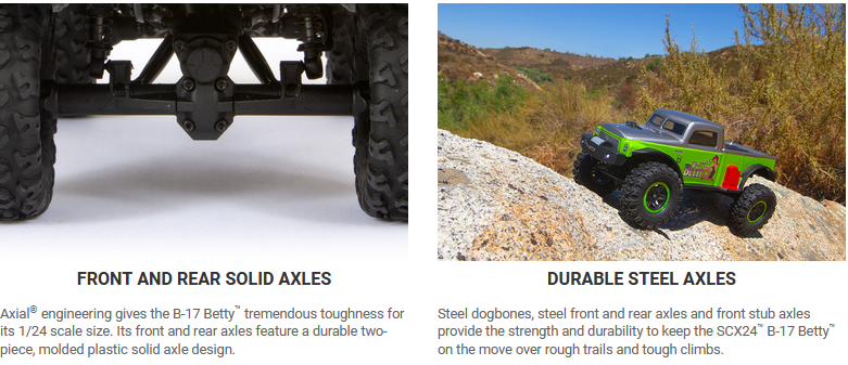 Add a new name to the lineup of versatile 1/24 scale SCX24™ vehicles from Axial® — one that also looks back to the very beginning of Axial® crawling. The SCX24™ B-17 Betty™ 4WD is a micro scale model that celebrates Axial® Racing's 15th year of RC adventuring by bringing back the legacy body, Rock Lizard tires and Rockster wheels of the original AX10 Scorpion. Fully ready-to-run, it will please new RC drivers and long-time Axial® enthusiasts alike with classic crawling performance plus Limited Edition collectability.