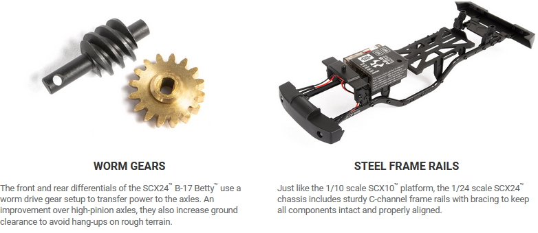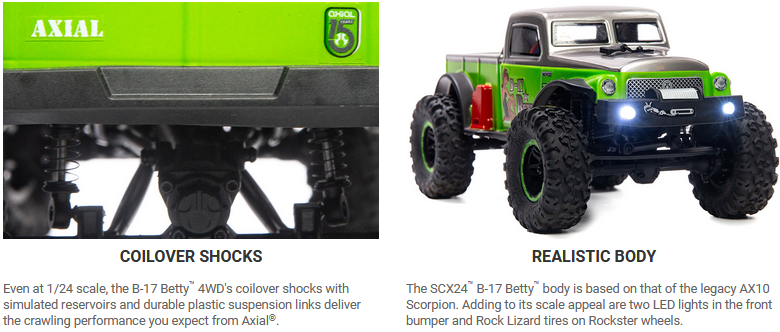 The SCX24™ B-17 Betty™ body's scale looks are topped off by two LED lights in the front bumper and Rockster wheels with Rock Lizard tires. The ready-to-run package includes the factory-assembled and finished vehicle, 2-channel radio, servo, ESC/receiver unit, 88T brushed motor, 7.4V 350mAh 2S LiPo battery and charger. Even "AA" transmitter batteries are included!