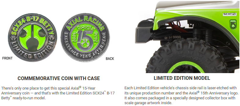Every SCX24™ B-17 Betty™ is one-of-a-kind, adding to the value of your purchase. It arrives in a specially designed collector's box with scale garage artwork. You'll find a commemorative coin inside that features the Axial® 15-Year Anniversary logo, in an attractive case and available only with this model. Each RTR's finished body includes a 15-year anniversary decal, and its chassis side rail is laser-etched with the anniversary logo and your model's unique production number.