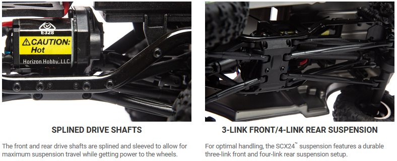 - Durable 3-link front/4-link rear suspension and coilover shocks for optimal handling and Axial®-quality crawling performance