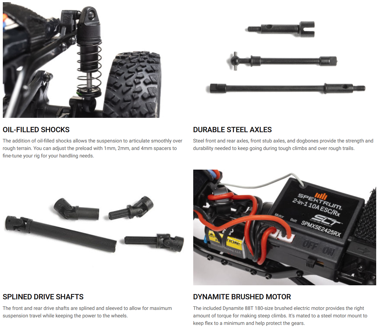 One of RC’s favorite micro rock crawlers is now better than ever! Axial updates the SCX24 Jeep JT Gladiator with oil-filled shocks and Spektrum electronics for even greater performance and value. New body colors add fresh style to your overlanding adventures.