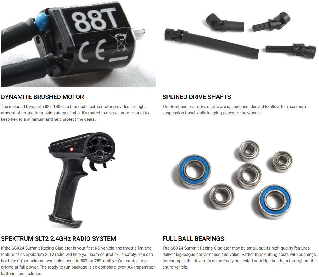 Inside the box, you’ll also find a rechargeable Spektrum LiPo battery, easy-to-use USB charger, and four AA batteries for the transmitter. That's all you'll need to take your overland adventures anywhere. As your first RC crawler or the latest addition to your collection of Axial rigs, the Summit Racing SCX24 Jeep JT Gladiator has no equal!