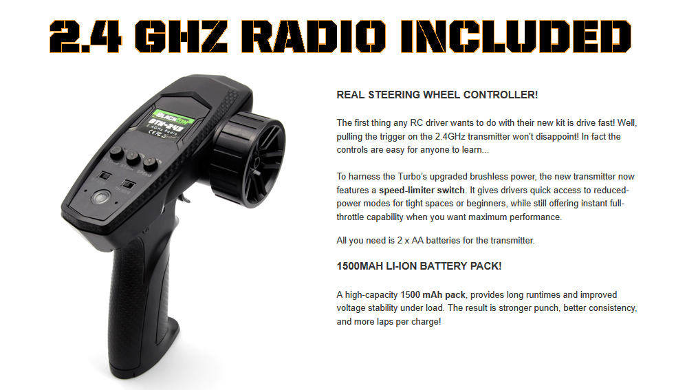 To harness the Turbo’s upgraded brushless power, the new transmitter now features a speed-limiter switch. It gives drivers quick access to reduced-power modes for tight spaces or beginners, while still offering instant full-throttle capability when you want maximum performance.