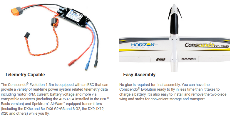 This is the most powerful, capable, and fun to fly Conscendo® yet! With the benefits of E-flite® engineering expertise, the Conscendo Evolution 1.5m powered glider is now better equipped to deliver higher speeds and even higher energy aerobatic performance — yet it's still as easy and fun to sport fly and soar as ever before. With a 3S LiPo battery, the factory-installed brushless power system — featuring a 30-amp telemetry-capable ESC, specially-tuned outrunner motor and folding prop — delivers plenty of thrust for fast climbs to soaring altitude, sport flying and aerobatics. Using a 4S battery, it delivers even more speed and thrust for unlimited vertical performance without the need for modifications or upgrades. The new higher density EPO airframe has the additional strength and stiffness to handle anything an intermediate to experienced pilot will want to do with all that power, performance and full 4-channel control. Yet the Conscendo Evolution is still easy to launch, fly and land — especially the BNF® Basic version equipped with a Spektrum™ AR637TA receiver featuring exclusive AS3X® and optional-use SAFE® Select technologies — which makes it the perfect choice for a first powered glider. Flight ready in less time than it takes to charge a battery, the Conscendo Evolution offers a wide range of pilots a unique flying experience that no other model can provide.