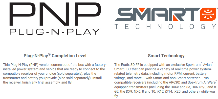 The E-flite Eratix 3D FF (Flat Foamy) 860mm offers the aggressive aerobatic plus smooth sport and slow-flying performance of similar class models – without all the hassles of buying components for and building one! It bolts/snaps together and can be ready to fly in less time than it takes to charge a battery compared to the glue, tape, and many hours it usually takes to assemble other "flat foamy" aircraft. Its lightweight yet extremely durable EPP airframe is mostly factory-assembled and includes a factory-installed power system and servos. The 3S compatible brushless motor is matched with an exclusive Spektrum Avian Smart ESC. The BNF Basic version is equipped with an AR630 receiver to deliver real-time telemetry data along with AS3X and SAFE Select technologies. It's small enough and light enough to be flown indoors in gymnasiums and other similar spaces or outdoors in yards, parks, and sports fields, making it a versatile addition to the hangar for a wide variety of pilots!