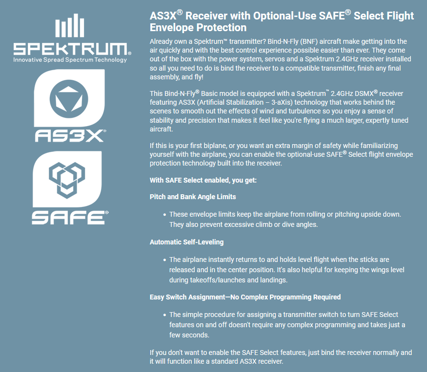 - Easy to fly with optional-use SAFE® Select flight envelope protection (BNF Basic version only)