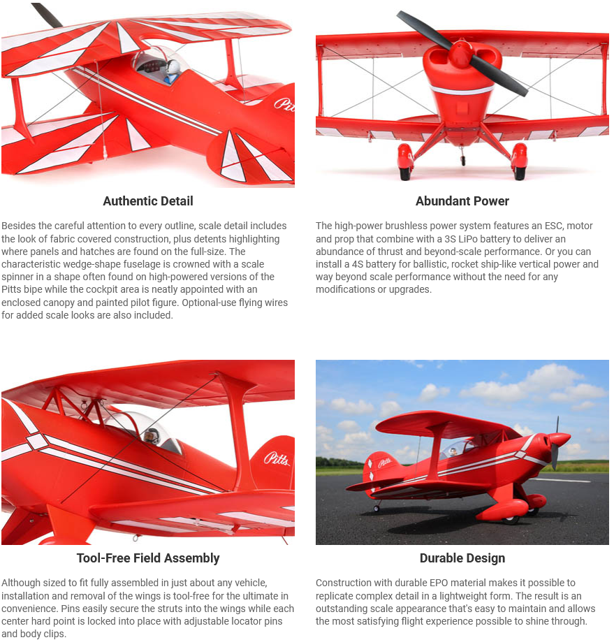 The E-flite® Pitts S-1S scale biplane is an officially licensed replica of the full-scale aerobatic icon that's expertly designed and equipped to deliver a flight experience that's easy to enjoy. The overall dimensions capture the revolutionary Pitts outlines while EPO construction helps present scale detail with a high level of durability. Even though installing and removing the wings is incredibly simple and tool-free, this beautiful bipe is sized so you probably never need to take it apart. Like the full-scale, under the hood is the kind of power that distinguishes this aerobat as a potent performer with virtually unlimited potential. Ballistic vertical climbs, dizzying snaps, crisp rolls and sharp corners are just a few of its specialties. Scale pilots will appreciate its smooth flight performance and level of detail, while everyone will enjoy its power system versatility. Whether you choose to fly this one-of-a-kind aerobat on a 3S or 4S LiPo, this Pitts S-1S bipe will deliver an aerobatic experience without equal.
