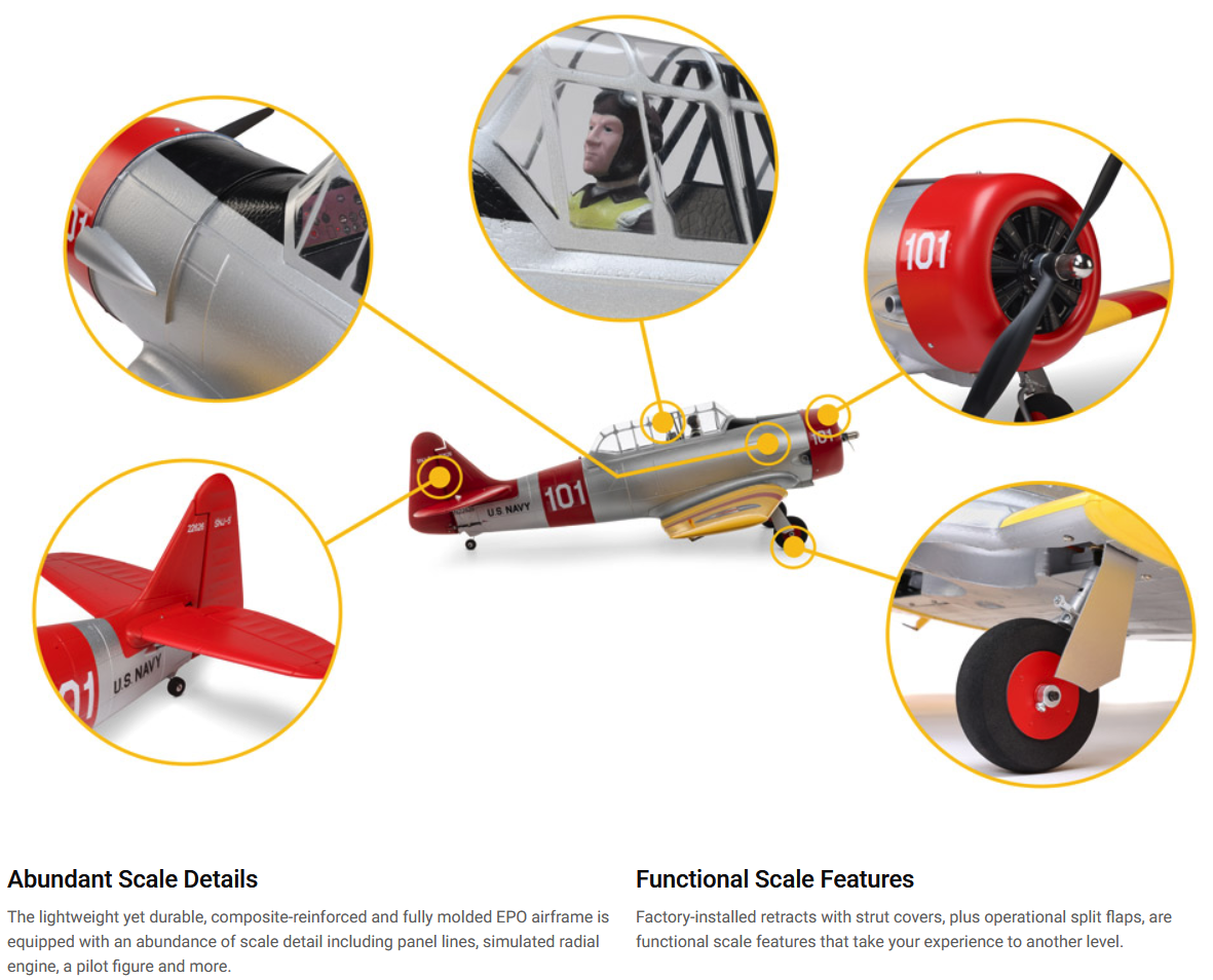 - Updated and upgraded to be the easiest to fly SNJ-5/AT-6 Texan model yet, capable of scale-like, sport, high-speed, and aerobatic flying