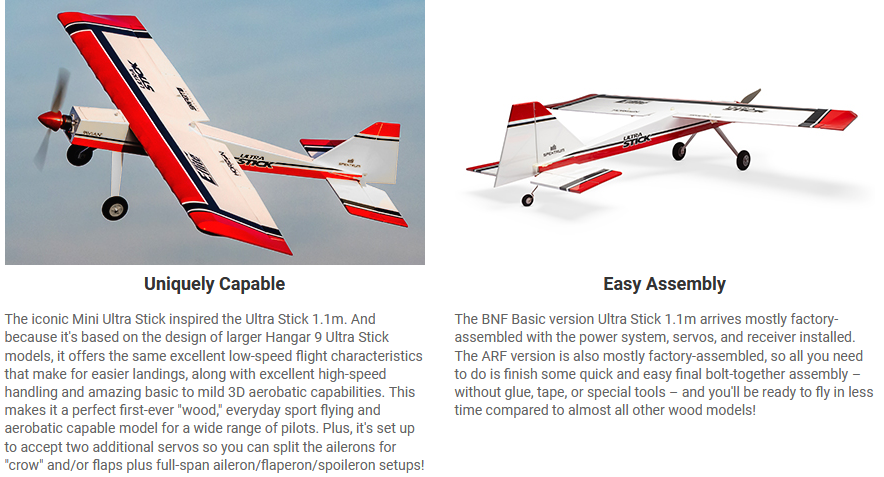 The Mini Ultra Stick was E-flite's first-ever "wood" PNP (Plug-N-Play) and ARF (Almost-Ready-To-Fly) model that became an instant best-seller when it was released in 2005. It was available for more than a decade and is still iconic to this day because it went together as easily and in as little time as foam PNP models, yet offered the advantages of lightweight, stiff, and strong wood construction that delivered flight performance unlike similar class fully-molded EPS and EPO foam models. The Ultra Stick 1.1m is an updated and upgraded version that is slightly larger to offer even better flight performance with extremely popular and common 3S or 4S 2200–3200mAh batteries. It's available in an ARF version that bolts together and is ready for installation of your preferred power system and electronics, or in a BNF Basic version that's equipped with four factory-installed servos, a Spektrum Avian Smart ESC and motor, plus a 6-channel receiver with AS3X and SAFE Select technologies. Both versions are ready to accept two additional wing servos for "crow" and/or flaps plus full-span aileron/flaperon/spoileron setups, as well as optional wheel pants to look even more like the larger Hangar 9 Ultra Stick models the design is based on. That design offers excellent low-speed characteristics for easier landings, incredible high-speed handling, and impressive aerobatic capabilities that intermediate to experienced pilots will appreciate and enjoy!