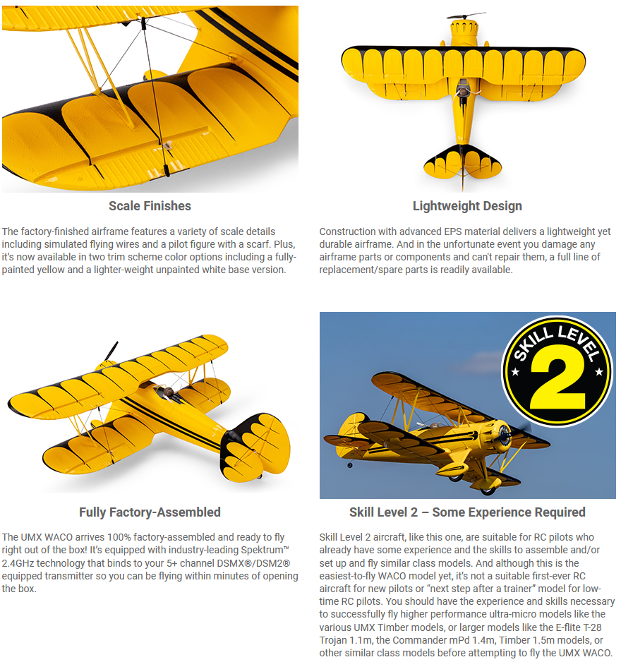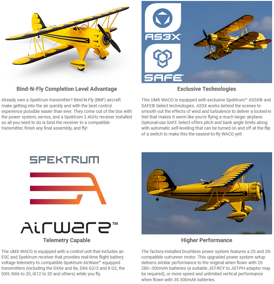 The E-flite® UMX™ WACO blends classic style with state-of-the-art features including a 2S and 3S compatible power system and optional-use SAFE Select to give you one of the most rewarding Golden Age biplane flying experiences at any size!