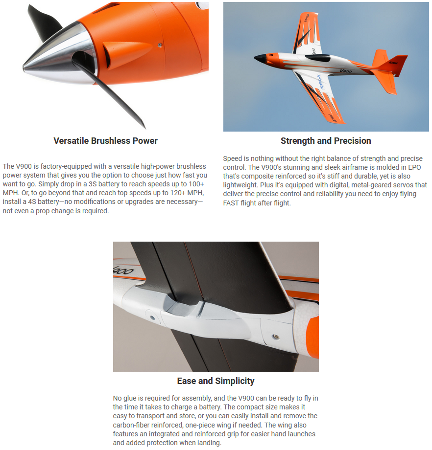 If you have a need for speed—adrenalin pumping, righteous SPEED—then you're going to love the E-flite® V900 airplane. The factory-installed high-power brushless motor and 60-amp ESC deliver unlimited vertical performance and incredible top speeds up to 120+ MPH without the need for upgrades or modifications. The lightweight yet stiff and durable airframe is equipped with digital, metal-geared servos to offer precision and reliability you'll appreciate flight after flight. No glue is required for assembly, and you can be flying in just the time it takes to charge a battery. So whether you're an intermediate pilot and this is your first high-speed airplane, or you're an experienced speed addict, you can be in the air and flying FAST in almost no time at all. But the V900 airplane doesn't just fly fast—it's well-behaved and slows down nicely for smooth approaches and landings, plus it's capable of aerobatics including huge loops, rolls, knife edge and more.