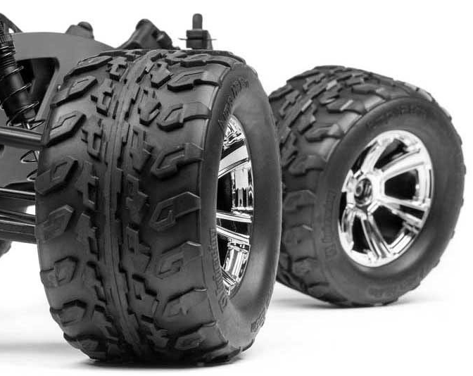 Huge all-terrain tires are one of the things that makes real monster trucks stand head and shoulders above everything else around them, and the Jumpshot MT V2 does not disappoint! Tackle terrain anywhere with tall, real rubber tires with huge lugs that can handle dirt, grass and loads more! You can hit the wet stuff, too: the extra-wide tires let you roll over mud, snow as well as over jumps and any obstacles that may get in your way! The tires are wrapped around extra-cool looking chrome wheels that look great whether the Jumpshot MT V2 is sitting on your shelf or kick up mud and rocks as it's flying across a stream.