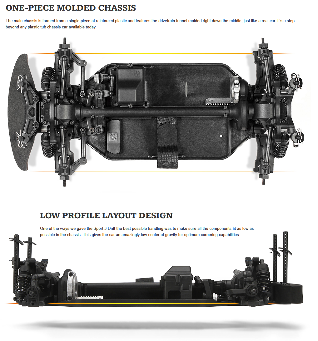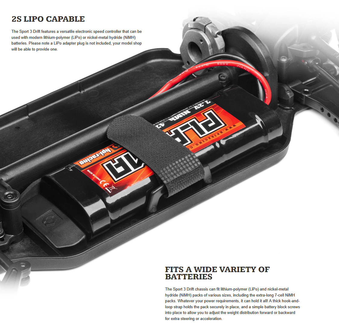 Under the hood, this 1/10th scale drift machine features the HPI Racing Sport 3 Touring Car chassis. With full-time shaft-driven 4WD, a fully sealed drivetrain, waterproof 2.4 GHz electronics and radio gear, independent double wishbone suspension, and adjustable oil-filled shocks, it’s ready to drift whenever you are!