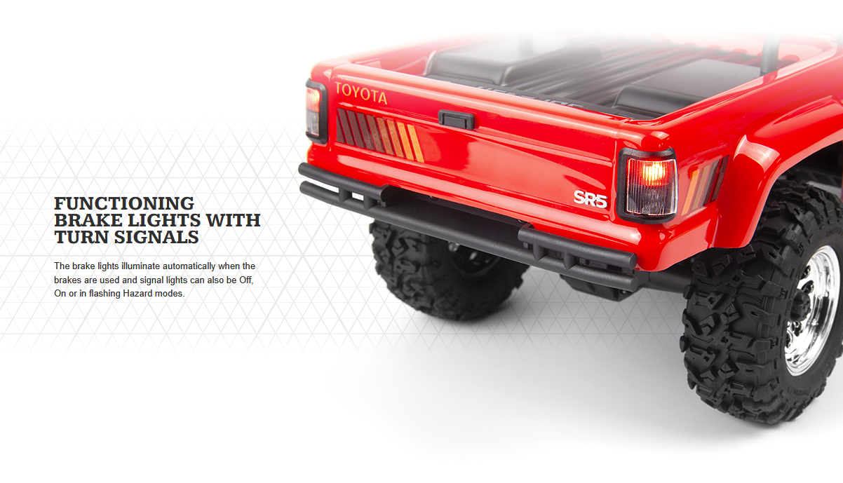 The Venture18 is equipped with a separate RL-700 LED light controller and LED lights for the headlights, taillights, brake lights, and turn signals. With five LED modes, you can customize the lighting to match your environment, enhancing visibility and scale realism. Whether driving day or night, the lighting system adds functionality and style to your crawler.