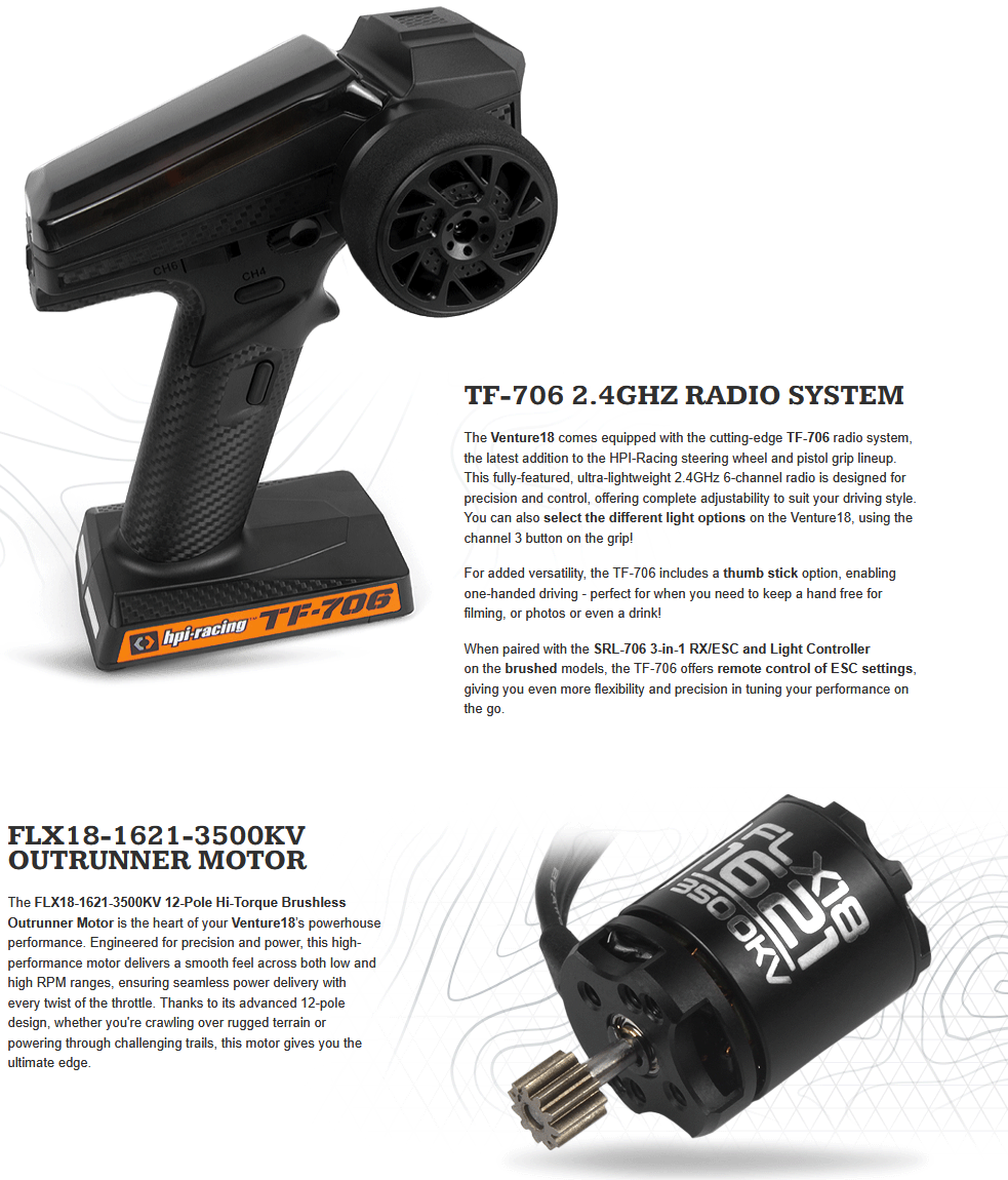 Introducing the HPI Racing Venture18 U4 Ford Bronco 4400 – built to dominate the trail with bold looks and rock-solid performance. Based on the proven Venture18 chassis, this compact crawler packs full-scale capability into a portable, go-anywhere platform. Whether you’re tackling tight technical trails or blasting over rocky terrain, the Venture18 U4 Ford Bronco is your ticket to unstoppable fun and exploration.