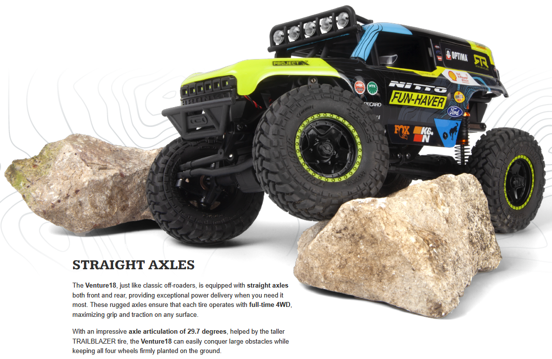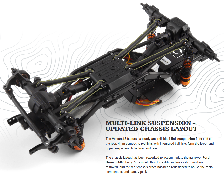 Just like its predecessor, the Venture18 U4 features a rugged formed steel C-channel chassis and realistic drivetrain design. It comes equipped with a precision-engineered all-metal 2-speed transmission, full-time locked differentials, 4-link suspension front and rear, and universal telescopic counter-rotating driveshafts – delivering true off-road performance in any environment. V2 Oil-filled shock absorbers provide smooth, consistent control, while the compact scale ensures you can take it anywhere.