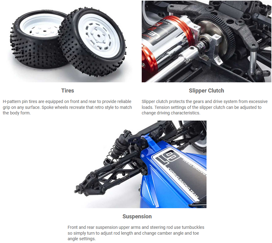 In the long and distinguished history of 1/10 EP (electric) R/C racing buggies, there are two types based on different drive systems. Rear 2WD models are typically easier to assemble and maintain and exhibit nimble driving characteristics; and then there are the equally popular 4WD models, which use drive force to all four wheels for superior traction on low-grip roads compared to 2WD. For drivers considering a step up from entry-level models, we are proud to introduce the Lazer SB Dirt Cross 4WD, which is a cost-optimized version of the competition-level ZX-5 that has continued to evolve performance and control as the cutting-edge of Kyosho’s worldwide 4WD EP buggy racing campaigns. While the suspension and driven system are retained from the proven Lazer ZX-5, the Dirt Cross does much more than reduce costs; it is designed to appeal to a new generation of R/C racers. While retaining its basic shape, the main chassis has been updated and optimized for the latest battery and motor systems. However, the body has been completely redesigned with a rear positioned cabin (instead of the usual forward-cabin of racing models), driver figure, and spoke wheels for a classic retro buggy style. As the Dirt Cross is based on a purebred race model, performance is guaranteed. Combining the most comprehensive fit out at a great value price, all the fun and performance off-road R/C has to deliver is perfectly optimized into this mid-range 4WD buggy.