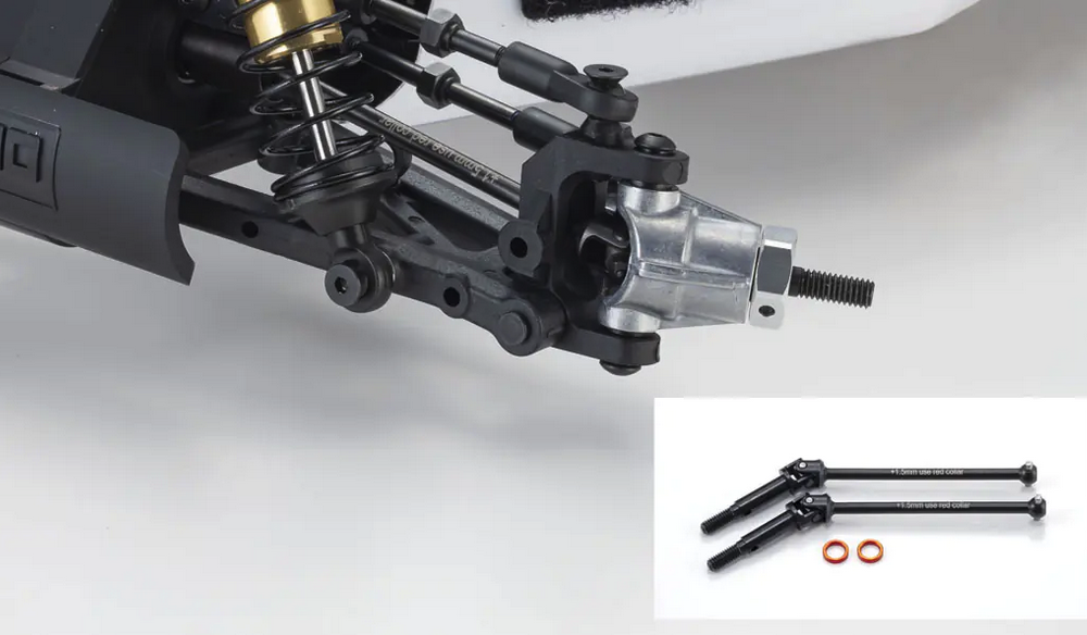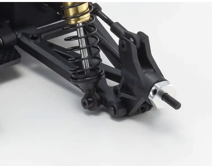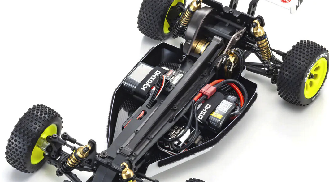 The oil shocks feature a gold anodized finish, inspired by the pressure shocks used on Kyosho's high-end models from the 1980s. Medium-hard springs in the front and rear ensure smooth, responsive handling.