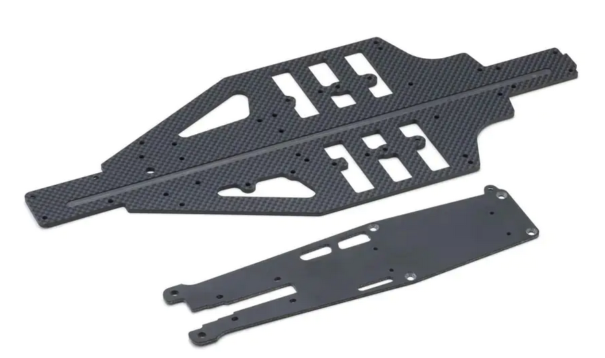The main chassis, made from a hybrid material with FRP layered between carbon, provides balanced flexibility under load for smooth handling. It also features slots inspired by the original design, allowing for a split battery configuration.