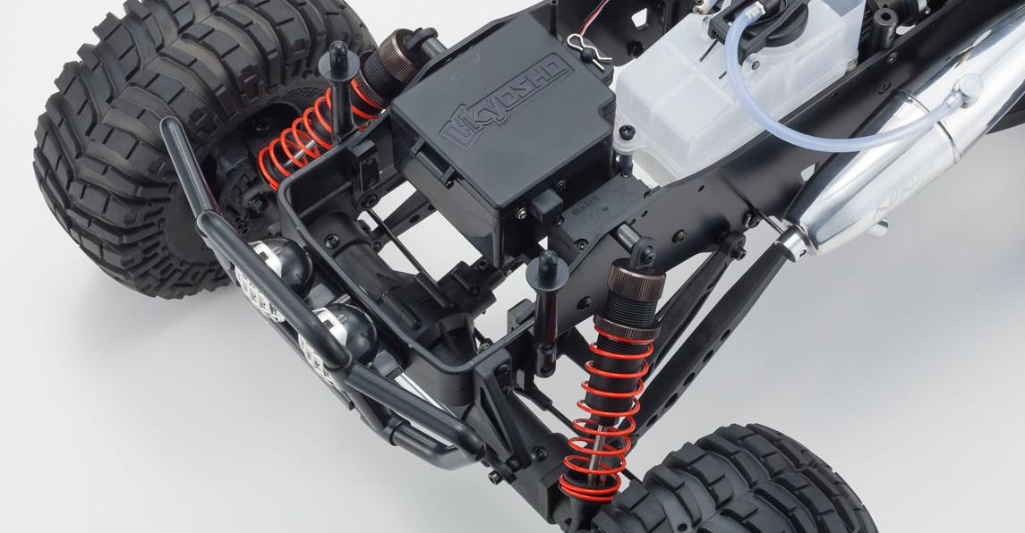 Weighing a hefty 4,200g, this heavy-duty machine is supported by the deep stroke of a 5-link suspension system. Large capacity resin big bore shocks deliver outstanding running performance.