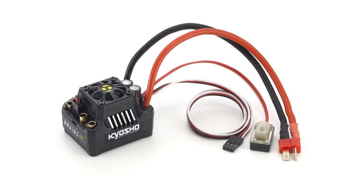 Equipped with KYOSHO SPEED HOUSE BRAINZ 8 waterproof speed controller with cooling fan. Brake, forward, auto-cut voltage, heat protection can be set individually.