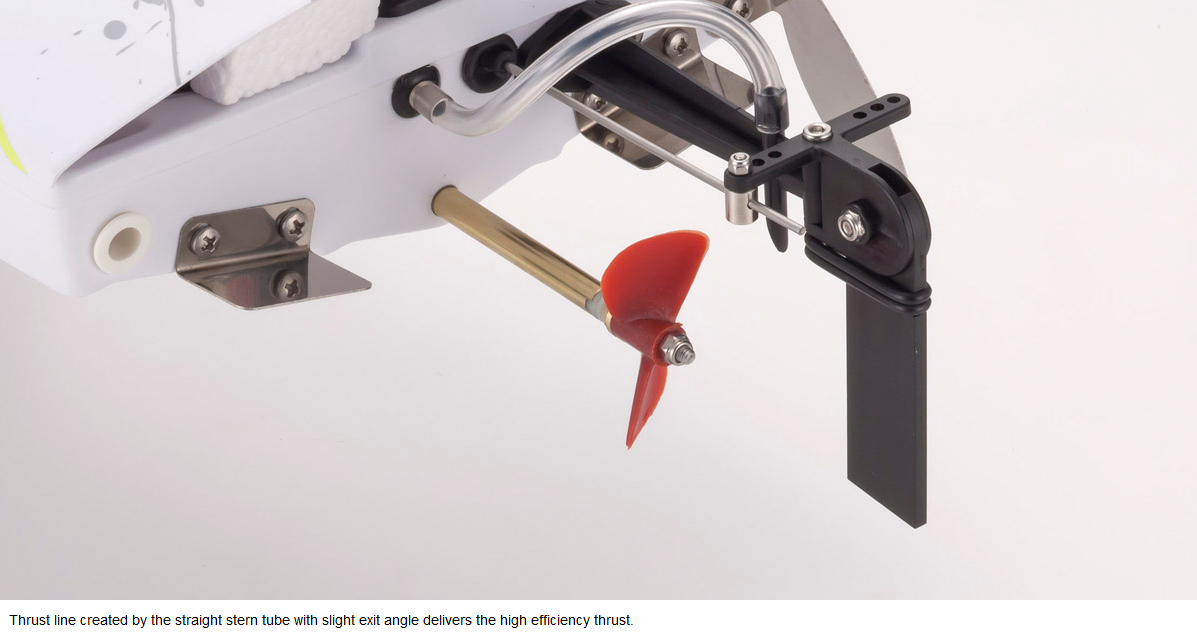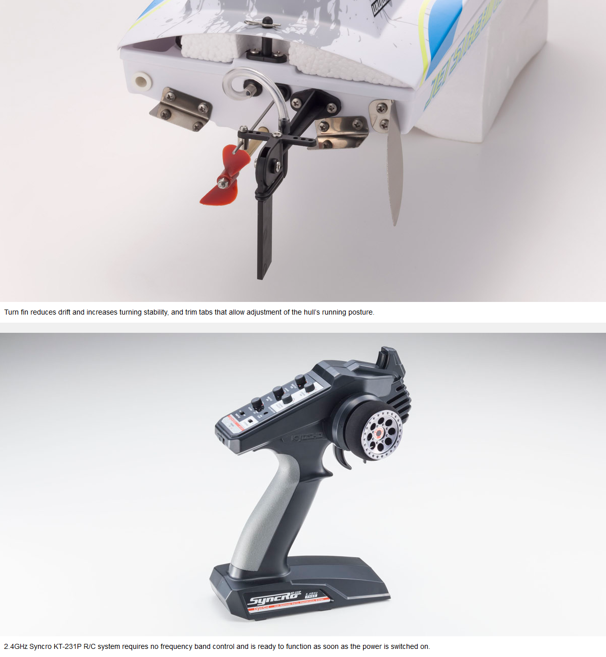 The W-step and deep V combine in a unique lower hull design to deliver true racing boat performance from its moderate 690mm length. Kyosho’s long history of accumulated boat design know-how has been concentrated in the advanced EP Jet stream 600. Waterproof ESC and servo, and a receiver with waterproof coated circuit board are contained within a waterproof radio box so you can be aggressive in attacking on-water courses. Furthermore, if capsized, the structure uses the change in center of gravity from water entering the ballast room to automatically right itself. For total peace of mind, the ESC is also equipped with a unique power cut-off program that returns the throttle to neutral if power drops below a safe level. Throttle can be applied again so the boat can be easily recovered. With its slight propeller angle, the straight stern tube and water-cooled G20 motor combine for exhilarating acceleration. High planing efficiency of the W-stepped hull combines with turning performance and durability of the deep V to produce amazing high-speed cruising. In addition to the unsinkable hull, the Jet Stream is equipped with flip-up rudder, stainless steel flaps and turn fin. All this performance technology is packaged into a user-friendly Readyset. Simply add batteries (sold separately) to the transmitter and charge the battery (included) for the motor, and the excitement of pure racing boat performance is ready to leave everything in its wake.