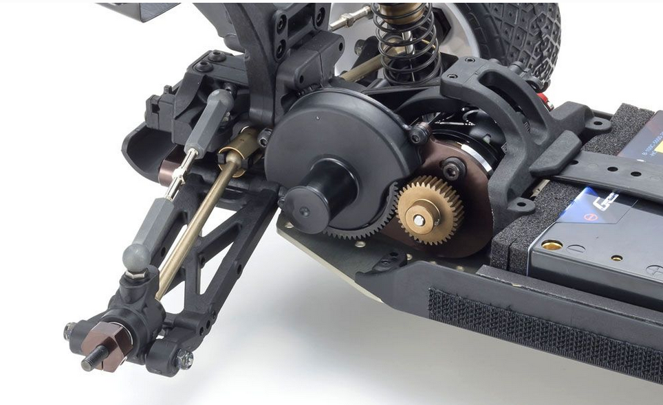 Spur gear is fixed directly to the main shaft with an adapter instead of a slipper clutch. Ball differential shaft, universal shaft and F wheel shaft are aluminum to reduce weight while minimizing friction and drive loss.