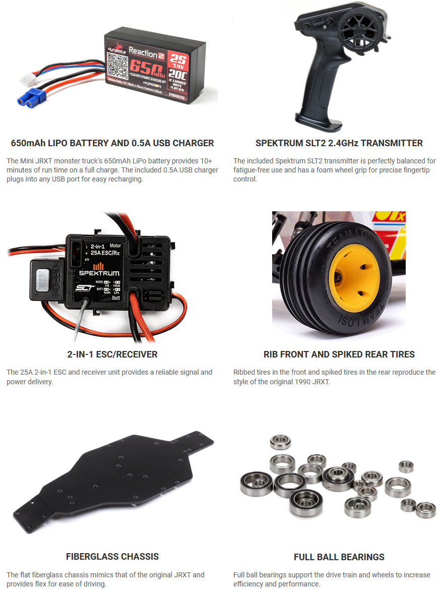 More than any other model of its time, the 1/10 scale Losi JRXT monster truck caused a rush of new interest in RC. If your memory replays fun days from years ago spent racing RC vehicles with friends and family, chances are good that the JRXT has a starring role. Even better, you can relive those memories for real today with the new, 1/16 scale Mini JRXT.