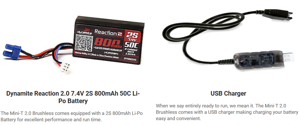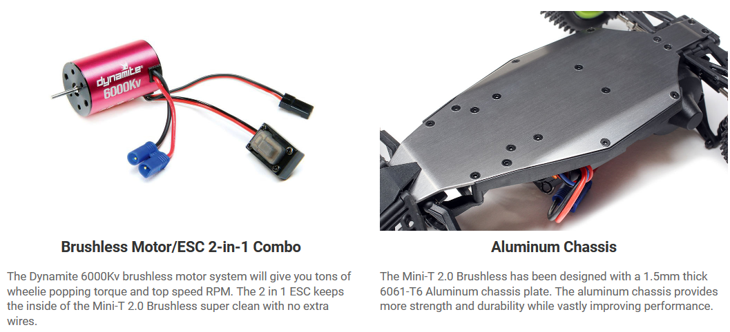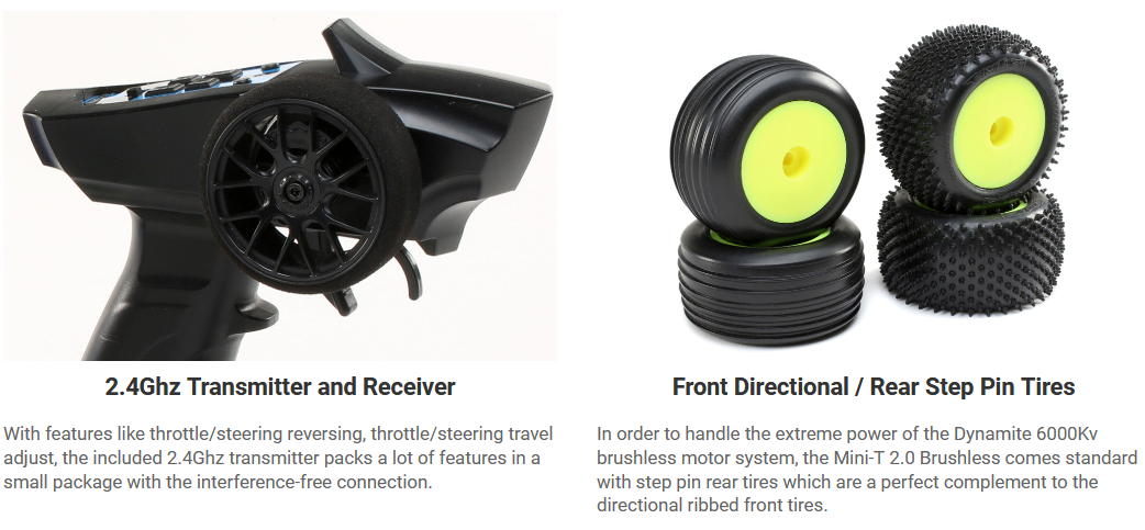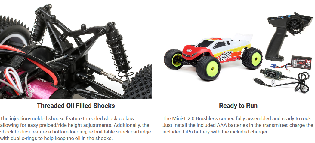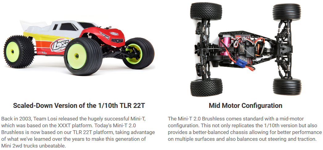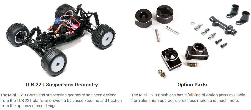 Reinvented with modern technology and Team Losi Racing® engineering, the Losi® Mini-T 2.0 1/18th-scale Brushless 2WD Truck honors the heritage of the original Mini-T with features and options never dreamed of back in the day. It may be small, but the powerful performance of the Brushless 2-in-1 motor/ESC configuration mirrors 1/10 th-scale size vehicles. The Mini-T suspension geometry is based on the high-end racing TLR® 22 platform. Plus, the Dynamite® 7.4V 2S 800mAh 50C Li-Po battery provides plenty of power and the 2.4Ghz radio system keeps you in control. It features a mid-motor configuration for better balance, rear step pin and front directional tires, and a full range of option parts all in a total ready-to-run package. TLR engineering and performance in a 1/18th size package you can take practically anywhere.