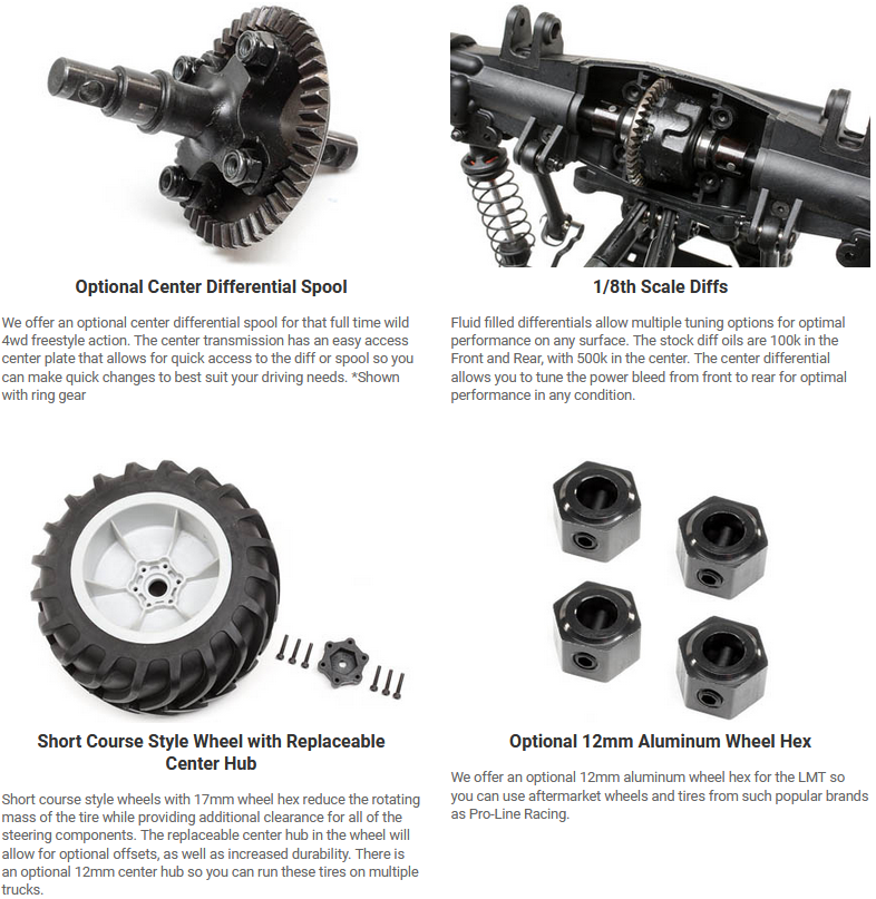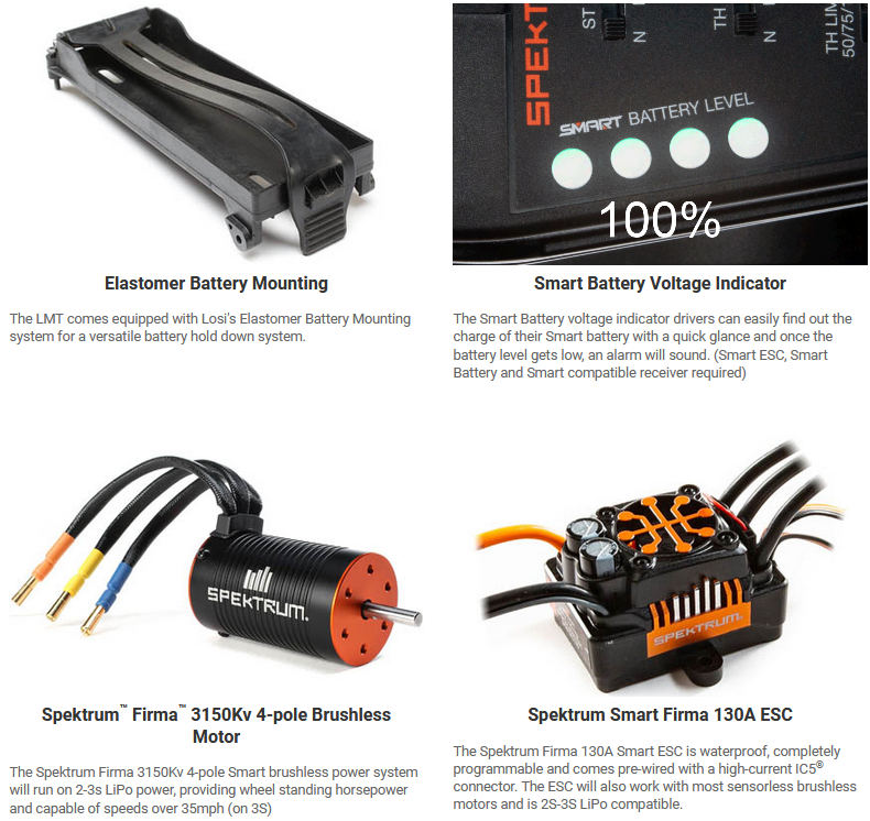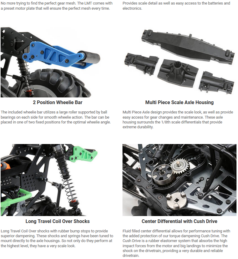 Completely designed from the ground up, the Losi® LMT 4WD Solid Axle Monster Truck is the first of its kind on the market combining all-out performance with incredible scale detail. Starting with the chassis, a twin vertical plate is designed to provide all of the performance adjustments needed to tune the truck for any situation. Whether you are a scale driver, a basher or a racer, the chassis is designed to accommodate multiple shock setups keeping you tracking straight, no matter the terrain. New multi-piece axle housings surround the 1/8th scale drivetrain. Additionally, the easy access center transmission comes stock with a center differential and allows for quick changes with the optional spool for that wheel standing action. For the true Monster truck experience, the axles also allow for optional 4-wheel steering and a new adjustable servo saver to keep the wheels pointed in the right direction. The Spektrum™ Firma™ Smart 130 Amp ESC and 3150kv 4-pole Brushless motor allow you to unlock blazing speeds. Drivers stay in control with a DX3™ transmitter and a Spektrum SR315 DSMR® 3-Channel Sport Receiver. A composite flip top cage adds scale realism and protection, as well as functionality so you can easily access your battery and electronics. Of course, the scale detail doesn't stop there with headers, drivers and LED lights and we've teamed up with Monster Jam for your choice of a Grave Digger or Son-Uva Digger body. The LMT Monster Truck has just thrown down the gauntlet on solid axle monster trucks.