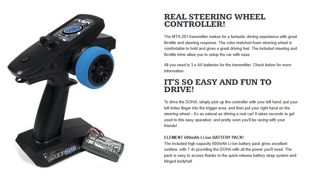 Included with the DOHA is the Maverick Element 600mAh Li-ion battery, a practical USB charger, the MTX-201 2.4GHz radio system, and the 2-in-1 water-resistant MSRS-201 receiver/speed and light controller. Additionally, the DOHA is fitted with LED lights on the roof cage, enabling operation in low-light conditions for extended playtime after sunset.