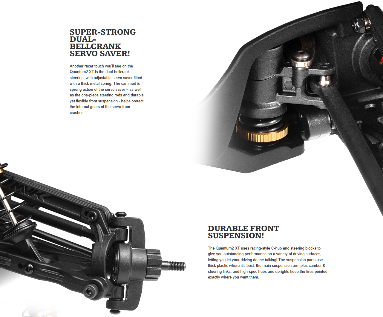 The Quantum2 XT features expertly designed parts molded in robust and durable materials to keep you driving and smiling for hours at a time! From extra-thick suspension arms and one-piece uprights to thick metal axles and driveshafts spinning on real metal bearings, the Quantum2 XT is built to last! The Quantum2 bodies are completely pre-painted are crafted from robust polycarbonate — a material known for its high tensile strength and durability. Despite its strength, this material retains flexibility, making it the top choice for high-quality RC bodies!