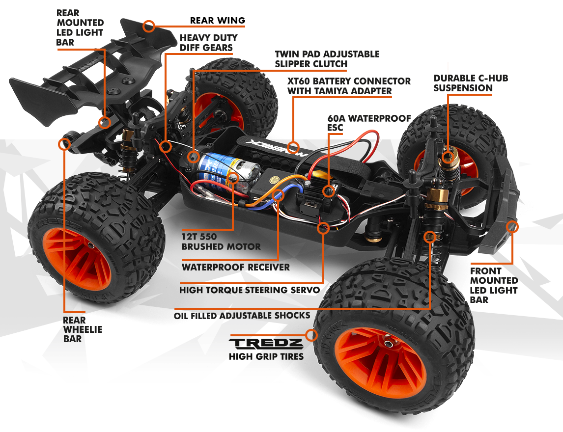 - Front & Rear Lights with functional Brake Light and Remote On/Off from Transmitter
